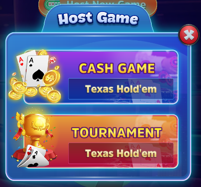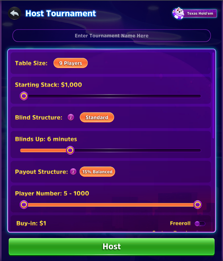 테이블 이름, 테이블 크기, 시작 스택, 블라인드 구조, 블라인드 기간, 지급 구조, 최대 플레이어 수, 바이인 범위, 수수료, 지급 통화, 토너먼트 시작 시간 등과 같은 "테이블 설정"을 입력합니다. 새 테이블을 시작하려면 "호스트"를 클릭하십시오.